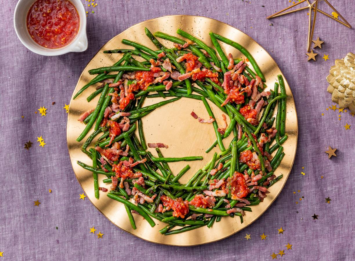 Leg een kleine kom in het midden van een ronde platte schaal. Leg de haricots verts rond de kom en verdeel de spekjes over de haricots verts. Besprenkel met de tomatendressing en breng op smaak met peper. Haal de kom weg en serveer.
