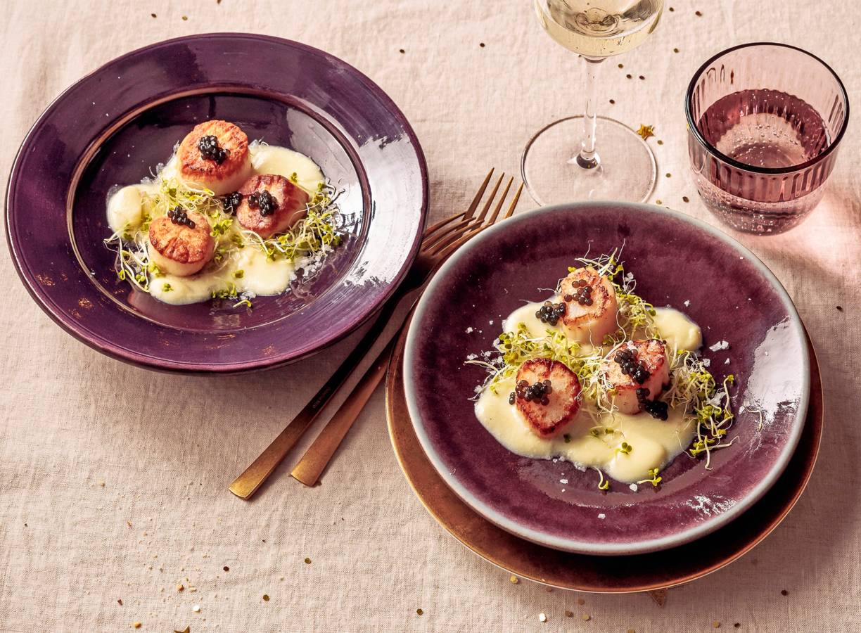 Schep de aardappelcrème op de borden. Verdeel de coquilles erover en bestrooi met peper en de zeezoutvlokken. Verdeel de groene kiemgroente en de zwarte vispareltjes in het midden van elk bord.