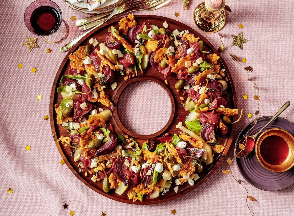 Een combinatie van zoet en hartig. De peer en carpaccio zijn een verrassend heerlijke combinatie in deze carpacciokrans met stoofpeer en parmezaancracker.