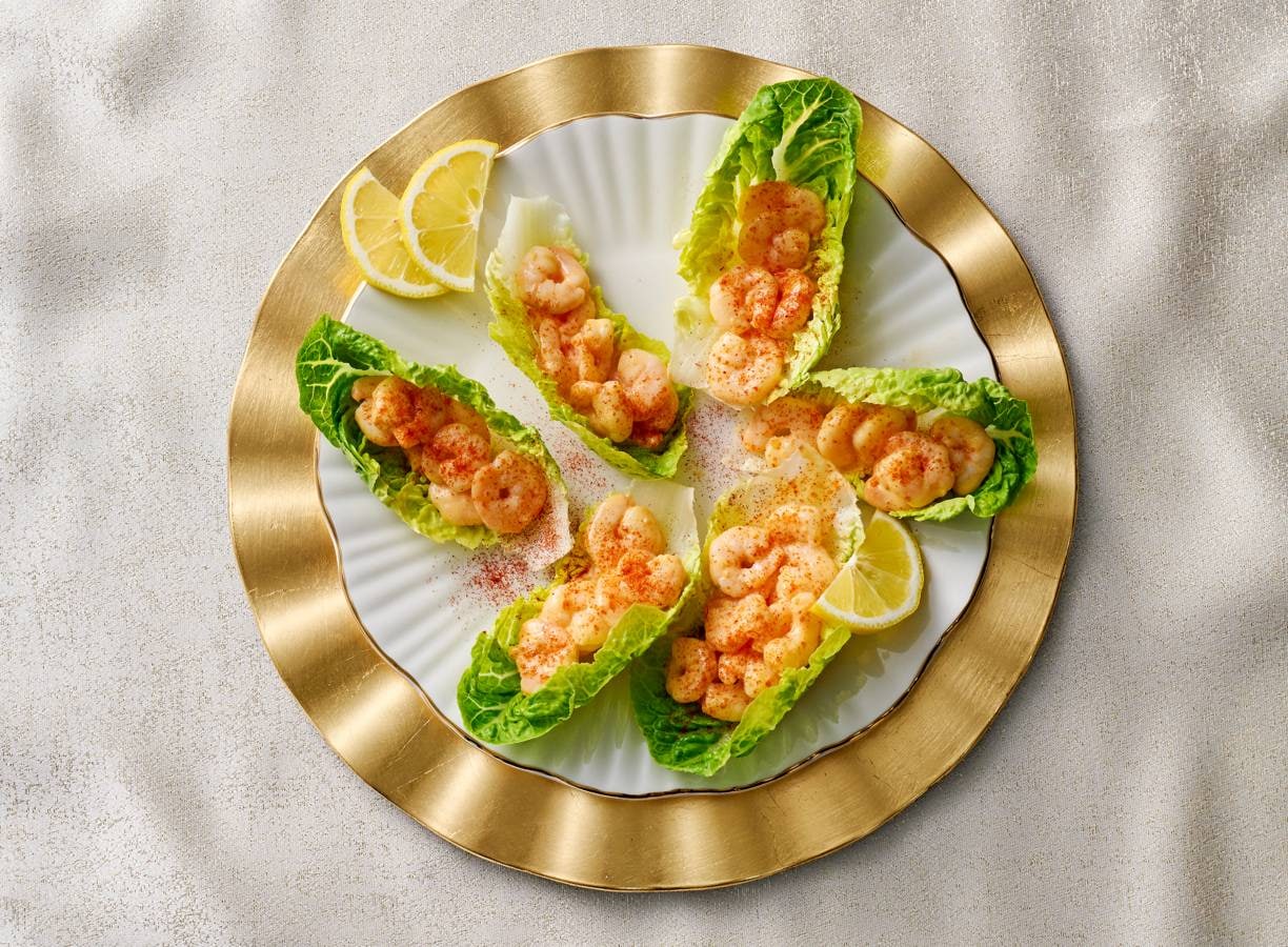 Eet de klassieke garnalencocktail eens uit het vuistje. Dit serveer je de garnalen met whiskycocktailsaus namelijk in een blaadje van babyromaine.