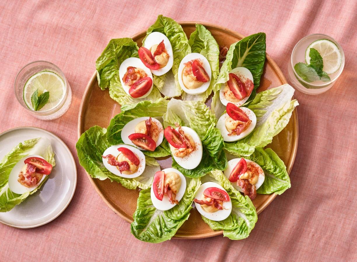 Gevulde eieren zijn een klassieker onder de borrelhapjes. Maar heb je ze al eens met een 'BLT'-inspireerde vulling geprobeerd? Lekker met ontbijtspek, snoeptomaatjes en romainesla!