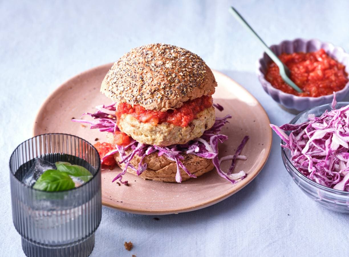 Pittige kip-tofuburger met rodekool