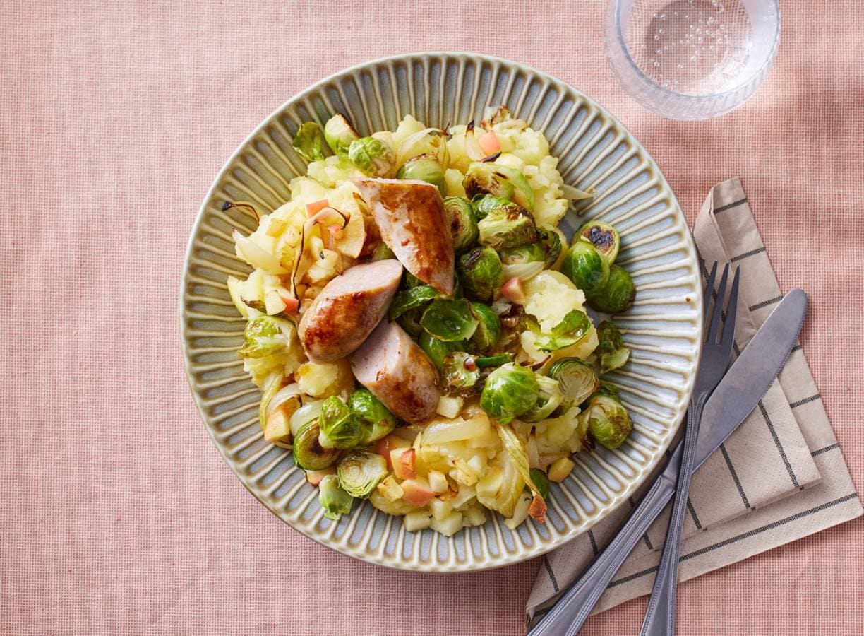 Hete bliksem is een oud-Nederlandse stamppot met appel. Dit recept combineert het friszoete van de appel met geroosterde spruitjes en knapperige braadworst. Ook lekker met vegetarische stamppotblokjes!