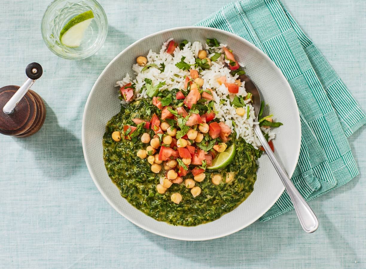 Deze romige spinazie'curry' serveer je met een frisse kikkererwtensalade en korianderrijst. Zet maar op tafel, dat wordt smullen!