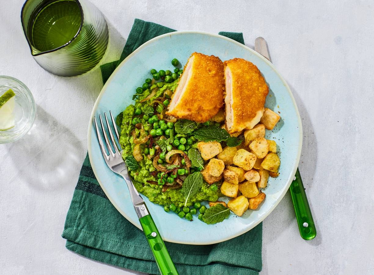 Vega 'cordon bleu' met romige tuinerwten-muntsaus en gebakken aardappeltjes