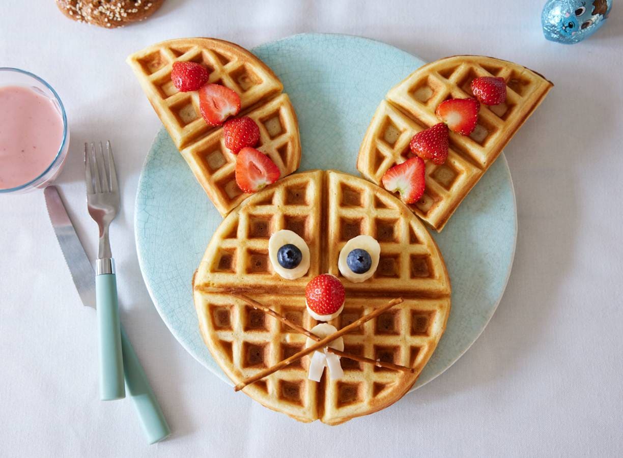 Deze wafel verkleed als paashaas, vraagt erom samen te delen! Extra genieten met de banaan, blauwe bessen en aardbei.