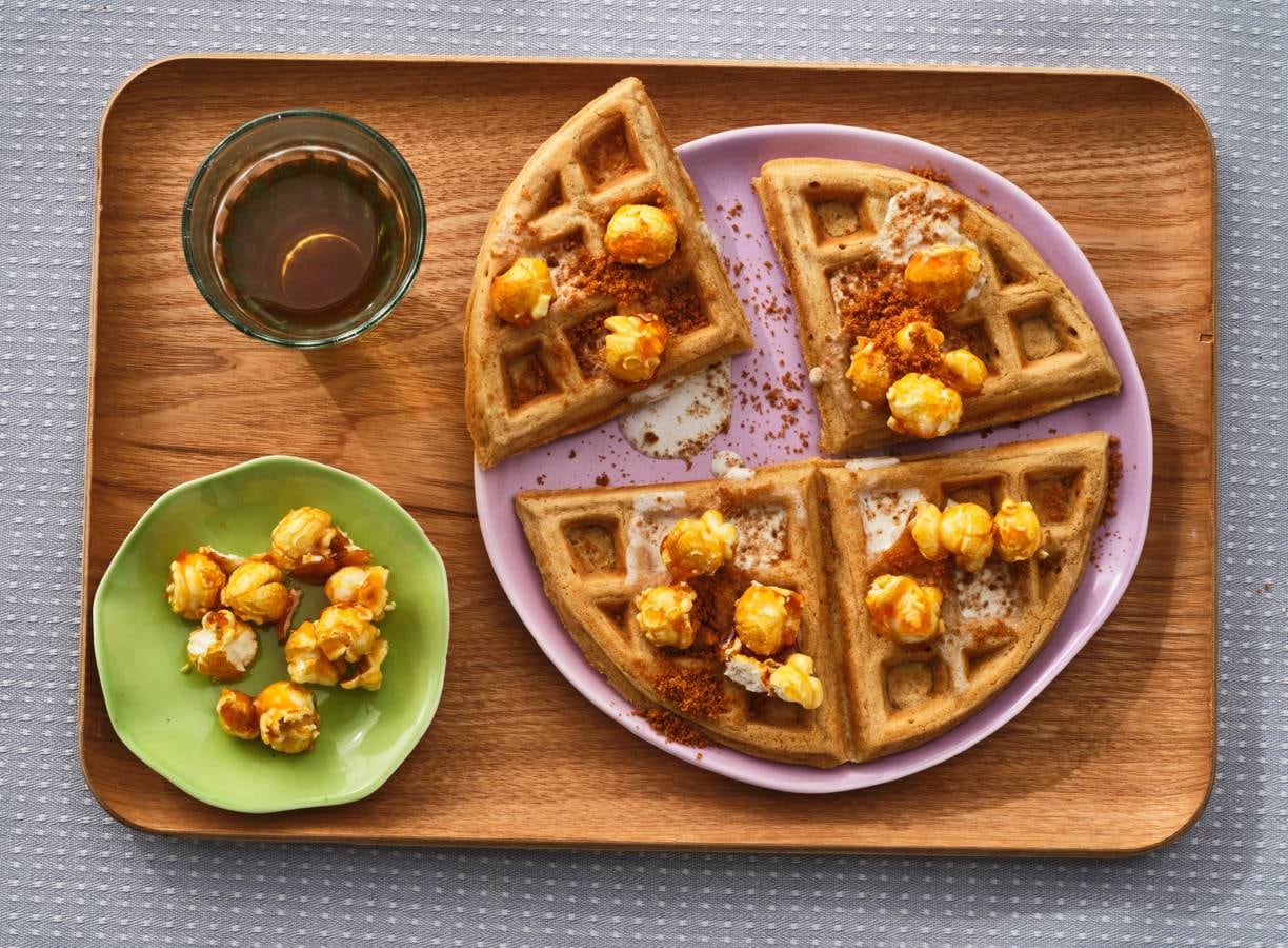 Speculaas gemengd in het wafelbeslag en afgetopt met karamelpopcorn. Deze vegan wafels zijn niet te weerstaan.