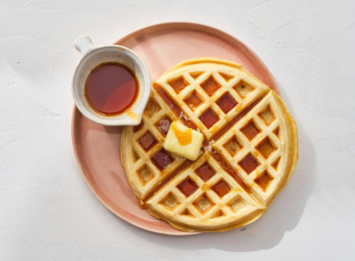 Verwarm de oven voor op 80 °C. Verwarm het wafelijzer voor. Vet het ijzer licht in met wat gesmolten boter, boven en onder. Vul het ijzer met ¼ van het beslag. Sluit het wafelijzer en bak de wafel in ca. 8 min. lichtbruin en gaar. Herhaal met de rest van de gesmolten boter en de rest van het beslag. Hou de gebakken wafels warm in de oven. Lekker met een klontje boter en ahornsiroop.