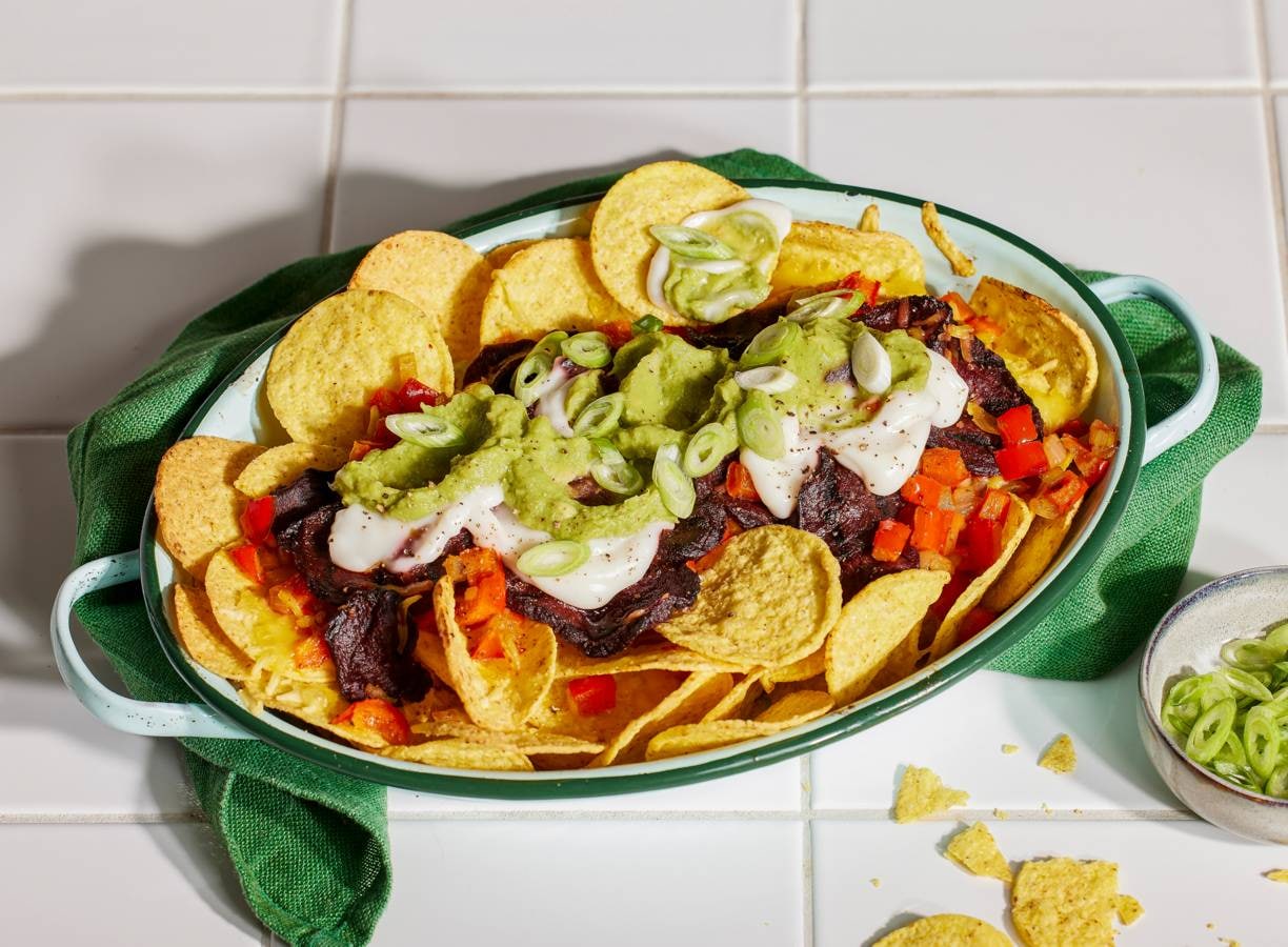Loaded nacho's met een vegan twist! Deze eet je met bietstuk, paprika, plantaardig alternatief voor kaas, haver fraîche en smashed avocado. Zo kan je voortaan je nacho's ook vegan eten.