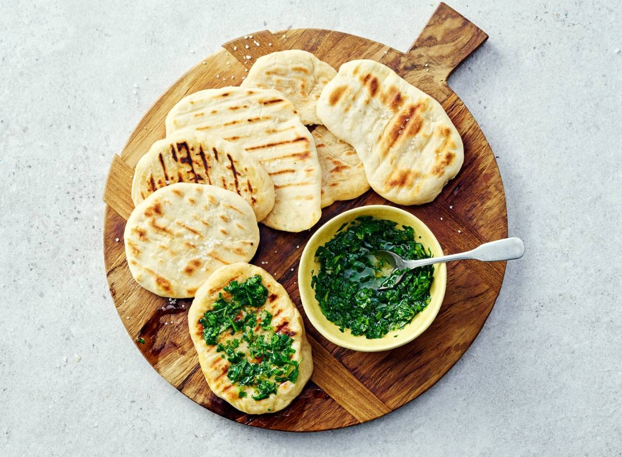 Voor deze knoflooknaans is de gebruikelijke yoghurt/melk vervangen voor een plantaardige kokosvariant. Daardoor hebben de naan een extra smaakje.