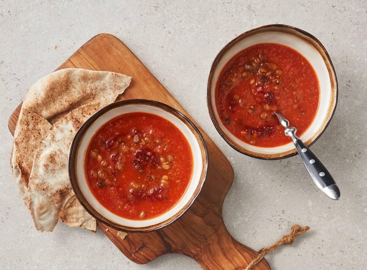 Groenterijk en snel klaar: met deze tomatensoep heb je in één klap bijna je hele dagelijkse aanbevolen hoeveelheid groente binnen. Handig! We vullen de soep met 'Italiaanse' roerbakgroente en linzen. De platbroden kun je lekker dippen.