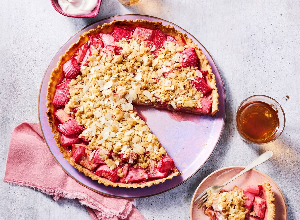 Verdeel het rabarbermengsel over de taartbodem en verdeel het kruimeldeeg erover, laat de randen vrij. Bak de taart in ca. 25 min. goudbruin en gaar. Laat iets afkoelen voor het serveren.