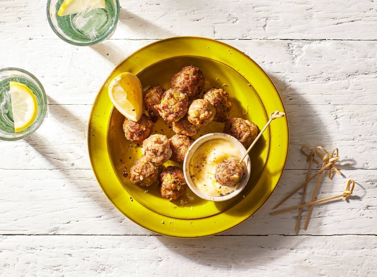 Boen ondertussen de citroen, rasp de gele schil en pers de helft van de vrucht uit. Meng het citroenrasp, 1 el citroensap (per 12 porties) en de mayonaise en breng op smaak met peper en eventueel zout.