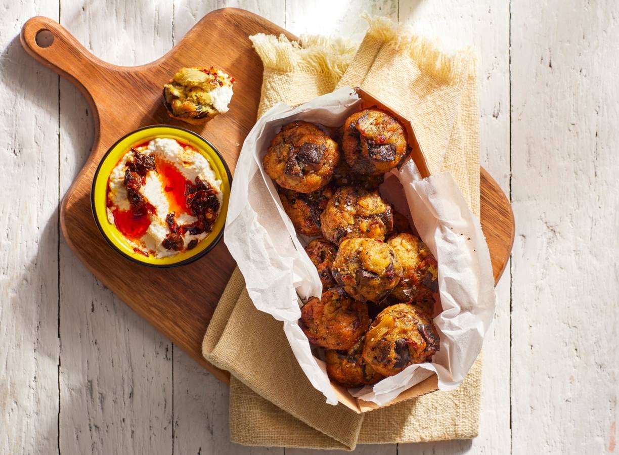 Deze borrelballetjes worden gemaakt van aubergine en ricotta en parmezaanse kaas. Gouden combi, toch? Ook lekker om mee te nemen naar een picknick.