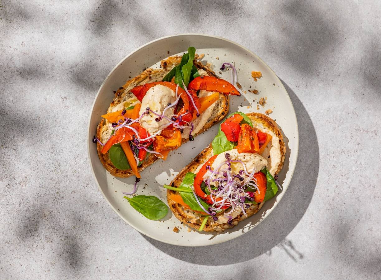Besmeer de sneetjes brood met de helft van de hummus, verdeel de babyspinazie en het paprika-peenmengsel erover. Schep de rest van de hummus op de broodjes en verdeel de kiemgroente erover.