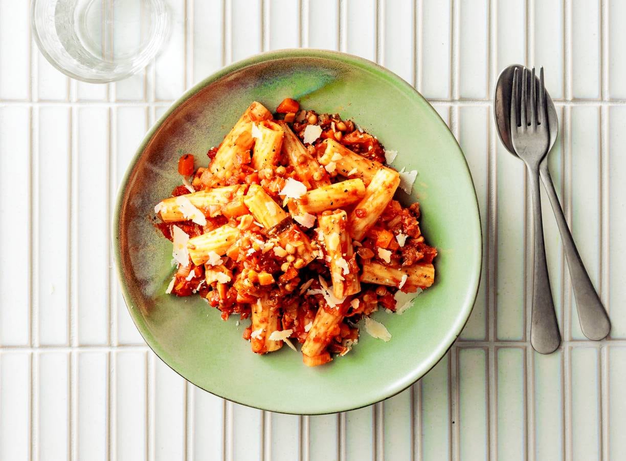 Rigatoni 'bolognese' met linzen