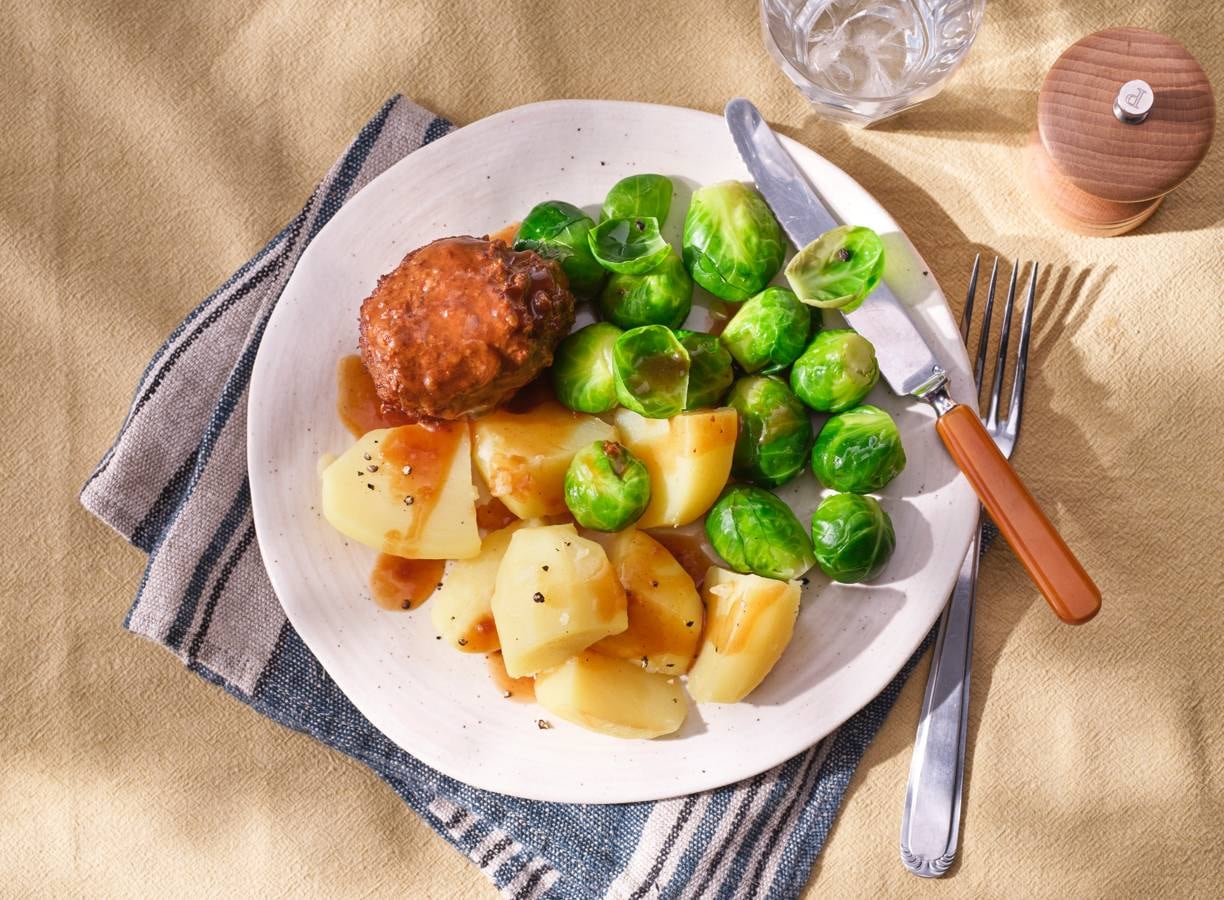 Gehaktbal in jus met spruitjes en aardappelen
