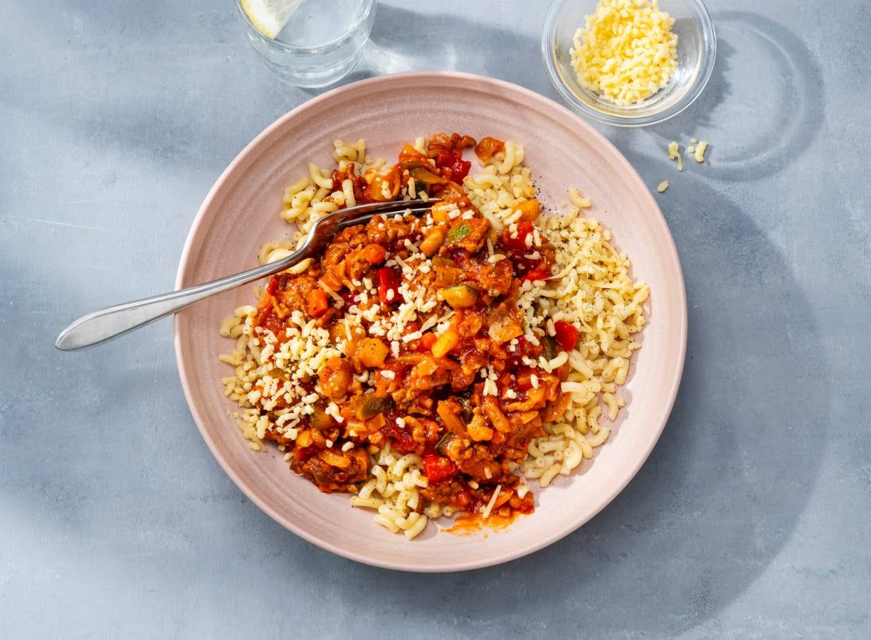- vegantipVervang het gehakt door 375 g plantaardig rulgehakt (AH Terra).