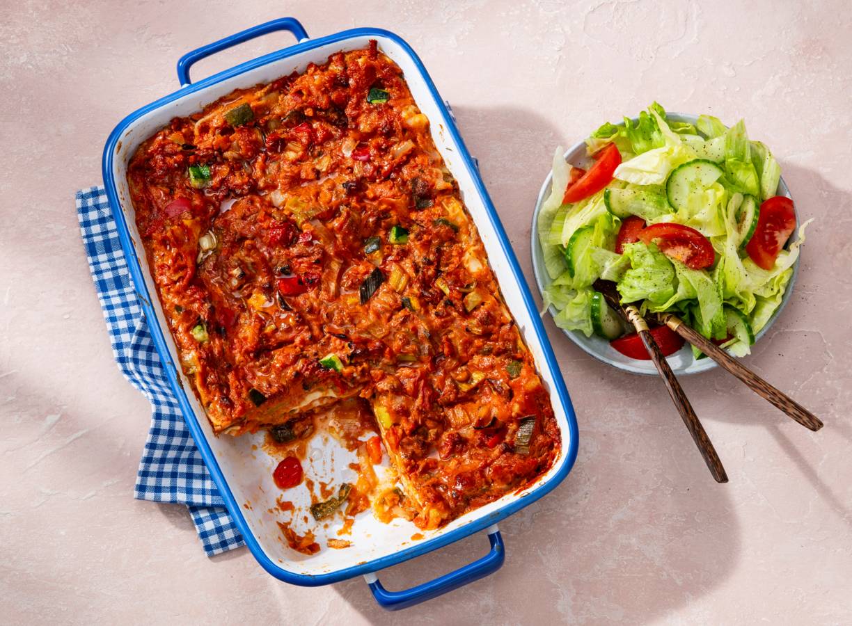 Handig: de voorgesneden groenten en saus zorgen ervoor dat deze lasagne al met een kwartier de oven in kan.
