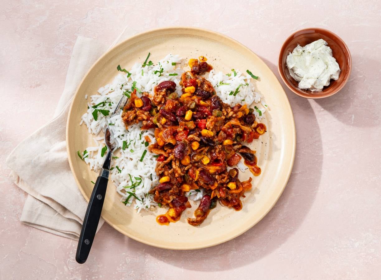 Kook ondertussen de rijst volgens de aanwijzingen op de verpakking. Verdeel de chili over borden. Serveer met de rijst.