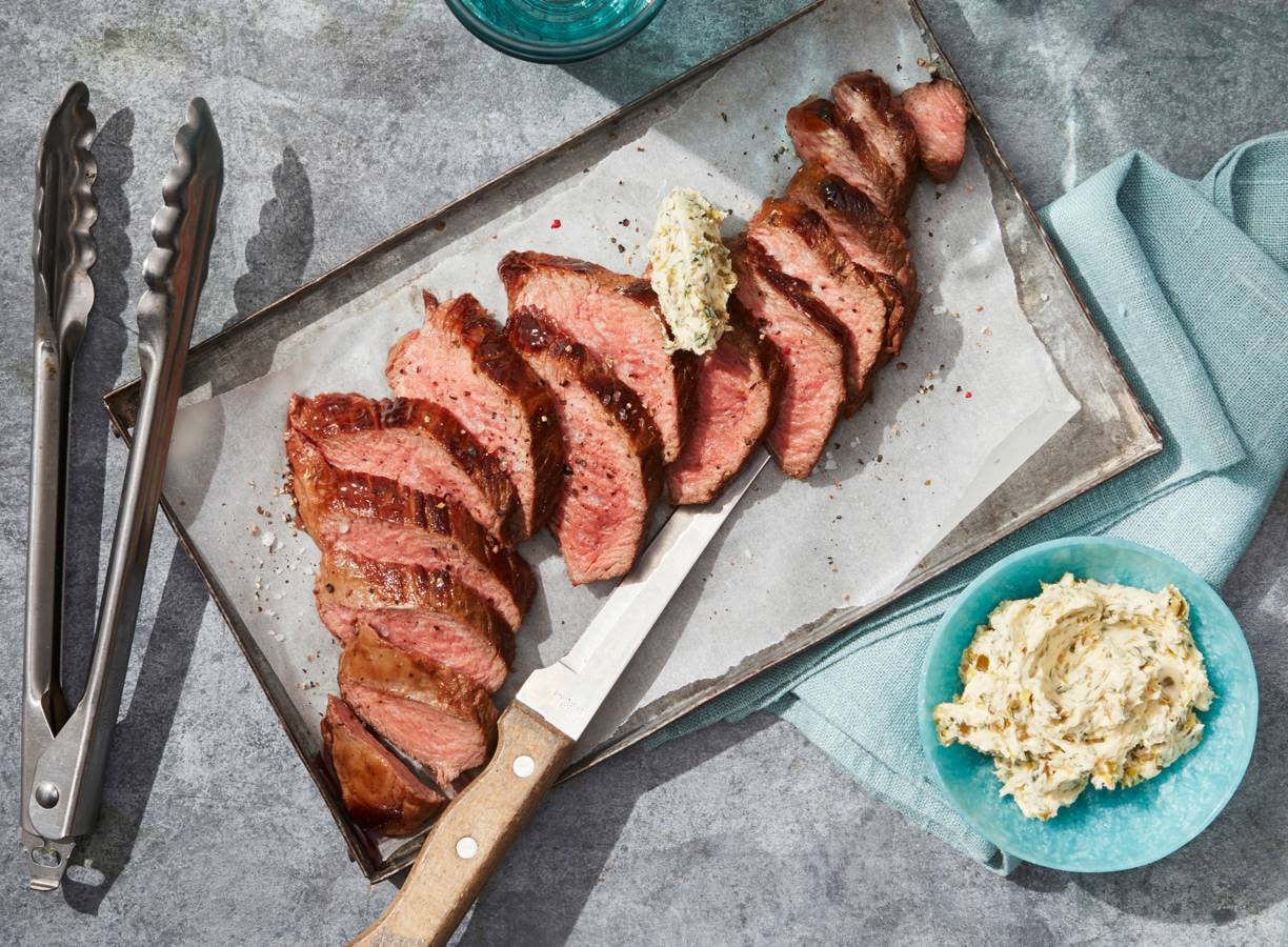 Steak van de BBQ is altijd lekker. Probeer dan ook eens deze diamanthaas (uit de schouder), dat dankzij de lichte marmerstructuur een mals sappig stuk vlees oplevert. Erbij: boter met kappertjes en citroen.