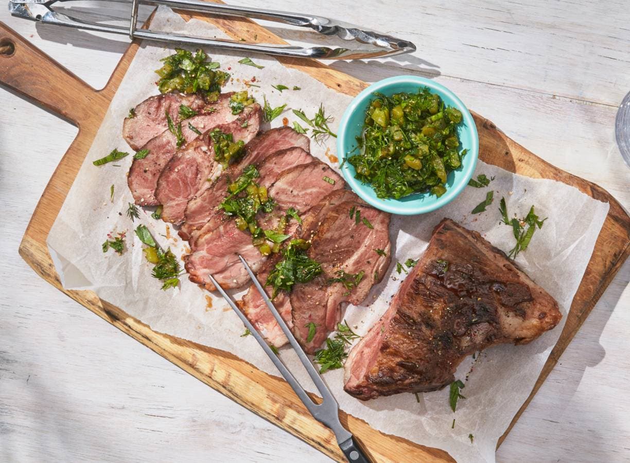Snijd de procureur in dunne plakken en serveer met de salsa.