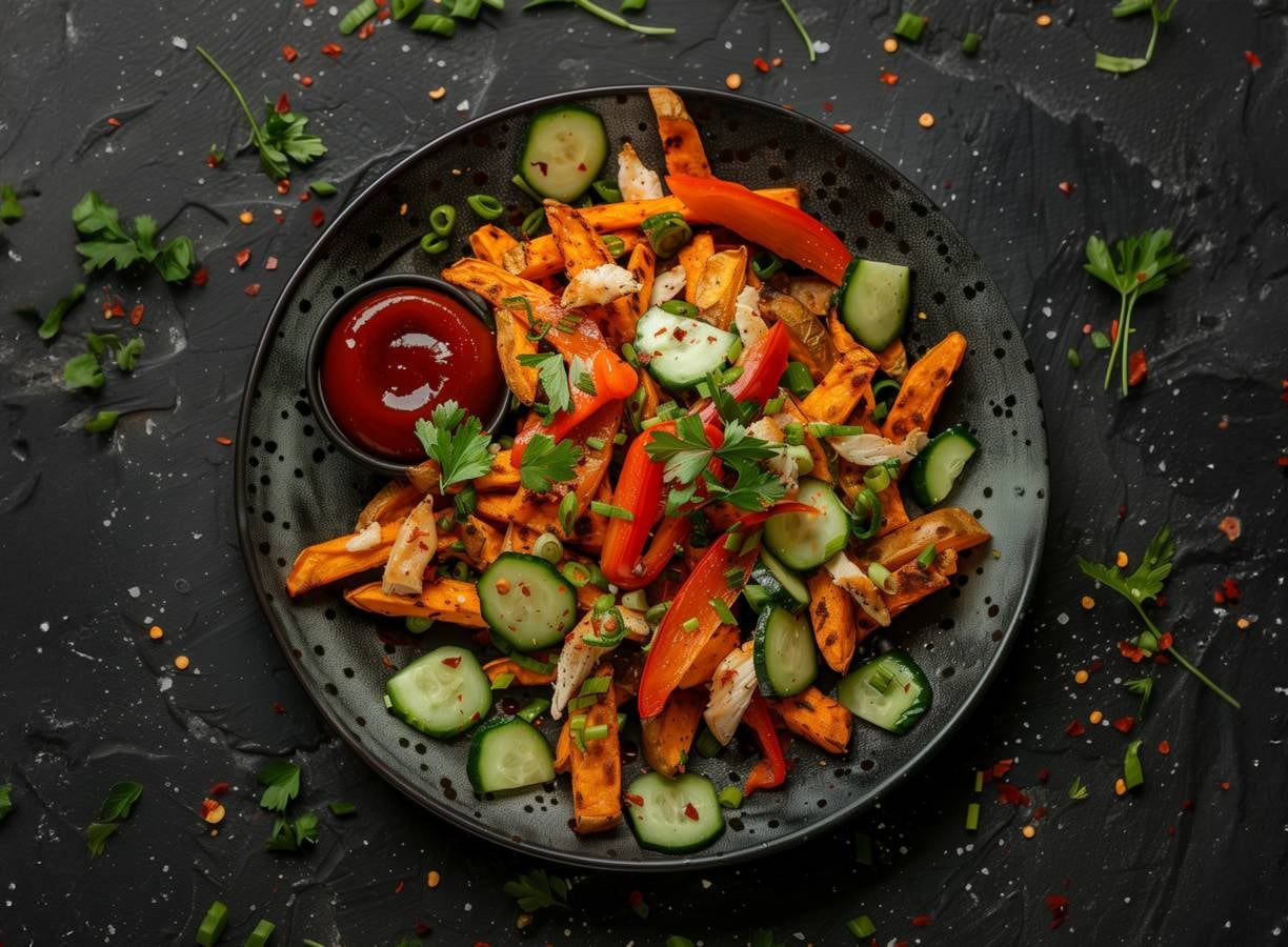 Verdeel de zoete-aardappelfriet over 2 borden en schep het kipmengsel erop. Garneer met de gebakken uitjes en de frisse komkommer.