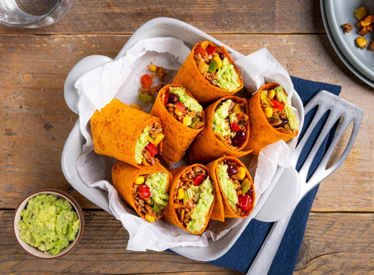 Verdeel het groentenmengsel over 1 helft van de paprika tortilla’s. Leg hier de guacamole op en vouw de tortilla’s dicht door eerst de zijkanten naar binnen te vouwen en vervolgens de tortilla’s op te rollen.