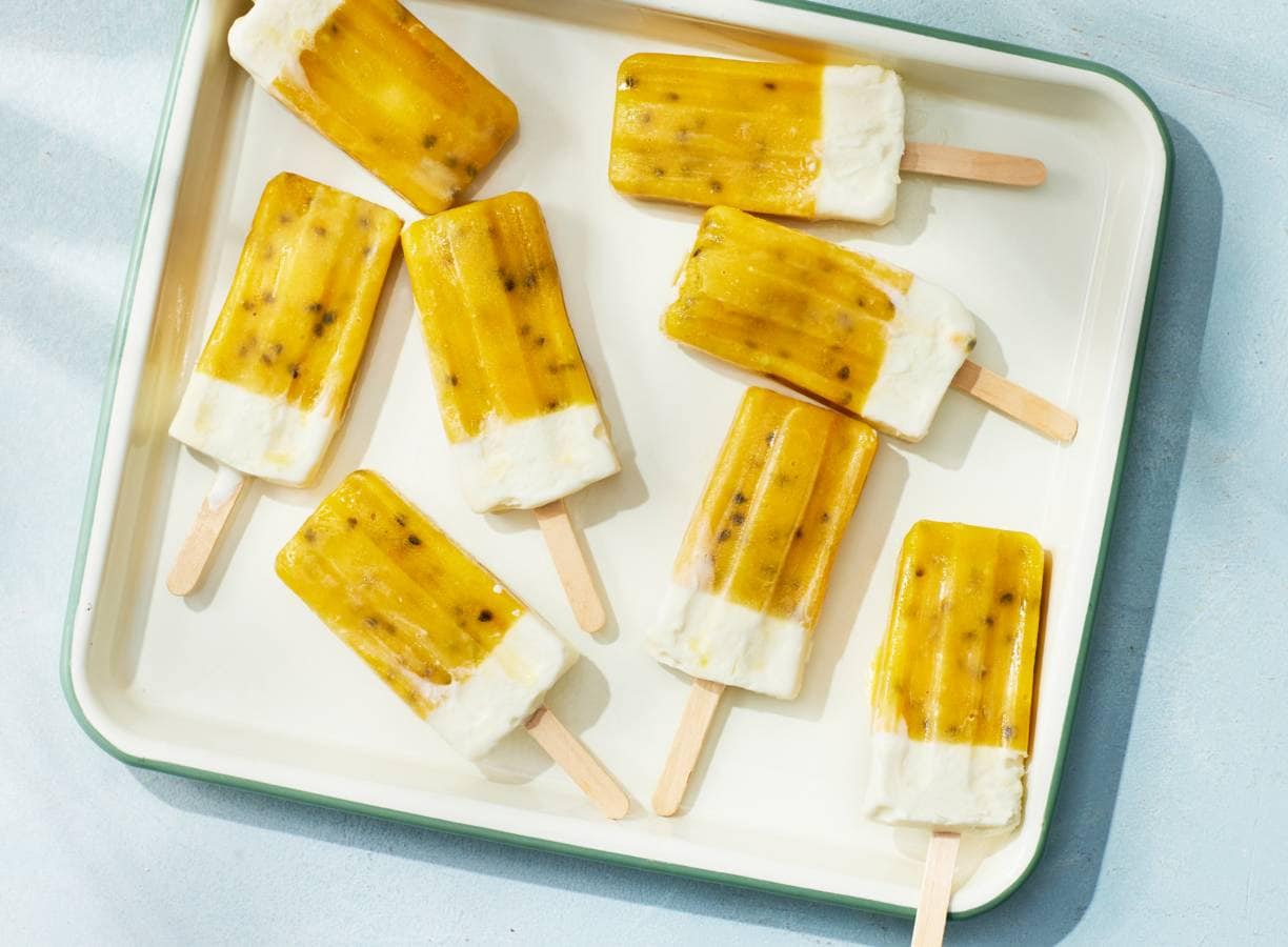 Meng met de ontdooide passievrucht en schenk in de ijsvormpjes. Zet de ijsjes ca. 45 min. in de vriezer. Haal het slagroomijs 15-30 min. voor tijd uit de vriezer om zachter te worden.