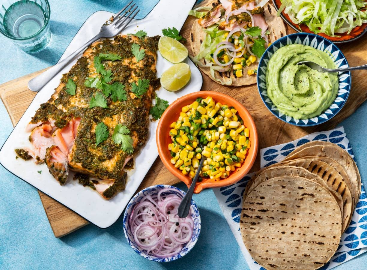 Doe de avocadocrème, ingelegde sjalot, fijngesneden ijsbergsla en de maissalsa in schaaltjes en zet ze op een grote serveerplank. Bestrooi de zalm met de rest van de koriander. Leg de gegrilde maistortilla’s erbij, zodat iedereen zijn of haar eigen taco kan vullen.