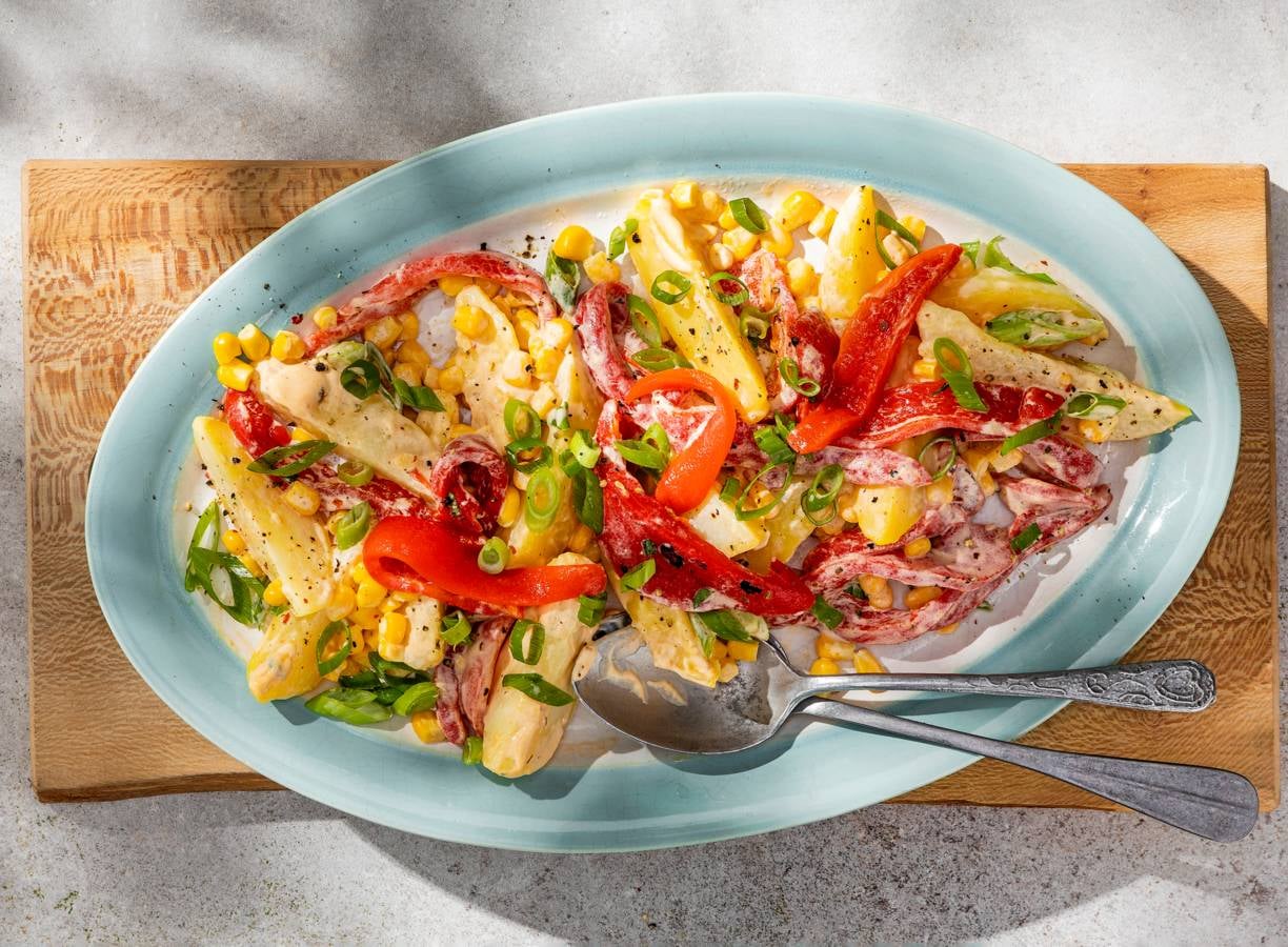 Pittige aardappelsalade met mais en gegrilde paprika
