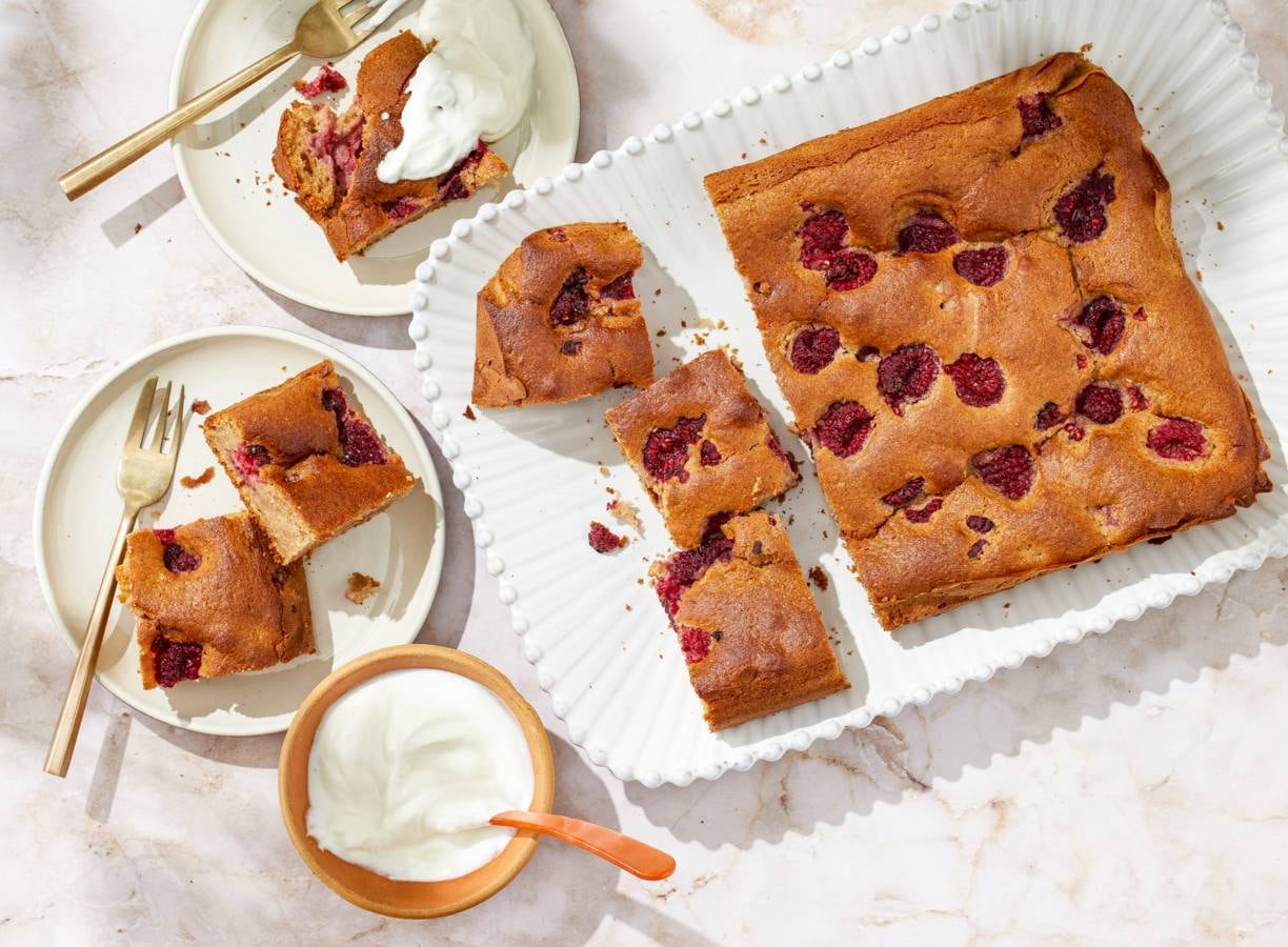 Deze yoghurtcake met framboos is het ideale tussendoortje voor na het sporten. Nog meer eiwitten toevoegen? Vervang dan de topping van slagroom voor een schepje skyr of kwark.