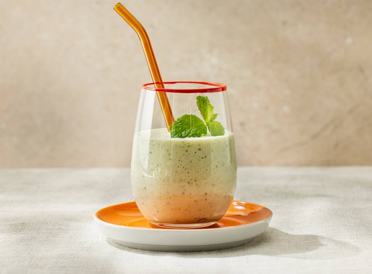 Doe de komkommer met de bleekselderij, appel, banaan, skyr, agavesiroop, muntblaadjes en citroenrasp in de blender en mix tot een gladde smoothie.