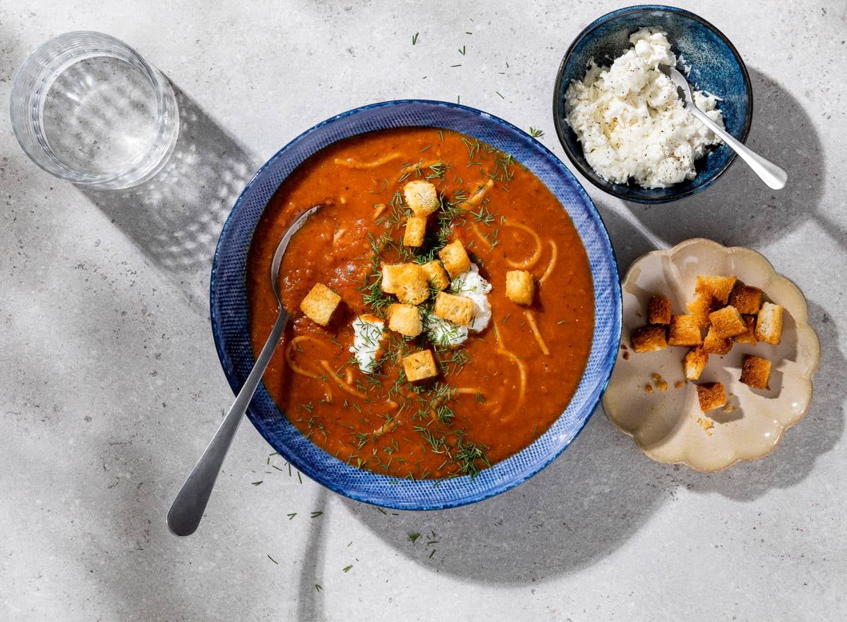 London kookt Nederlandse klassiekers met een twist, zoals deze tomatensoep met vermicelli. Lekker met zelfgemaakte croutons, dille en een romig mengsel van ricotta en pecorino.
