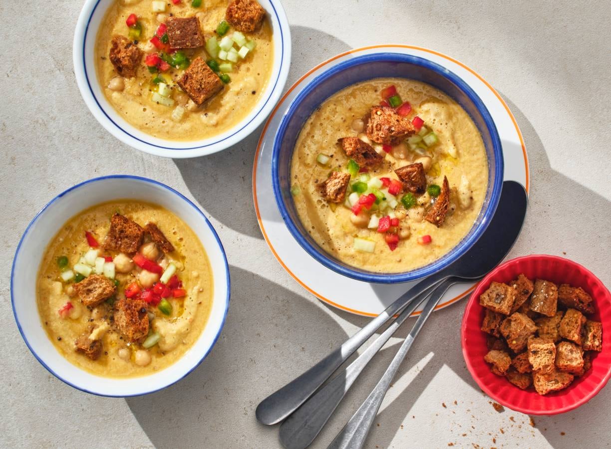 Snijd de achtergehouden paprika en komkommer heel fijn. Serveer de koude soep in kommen met de croutons en de achtergehouden kikkererwten, paprika en komkommer. Besprenkel met de rest van de olie.