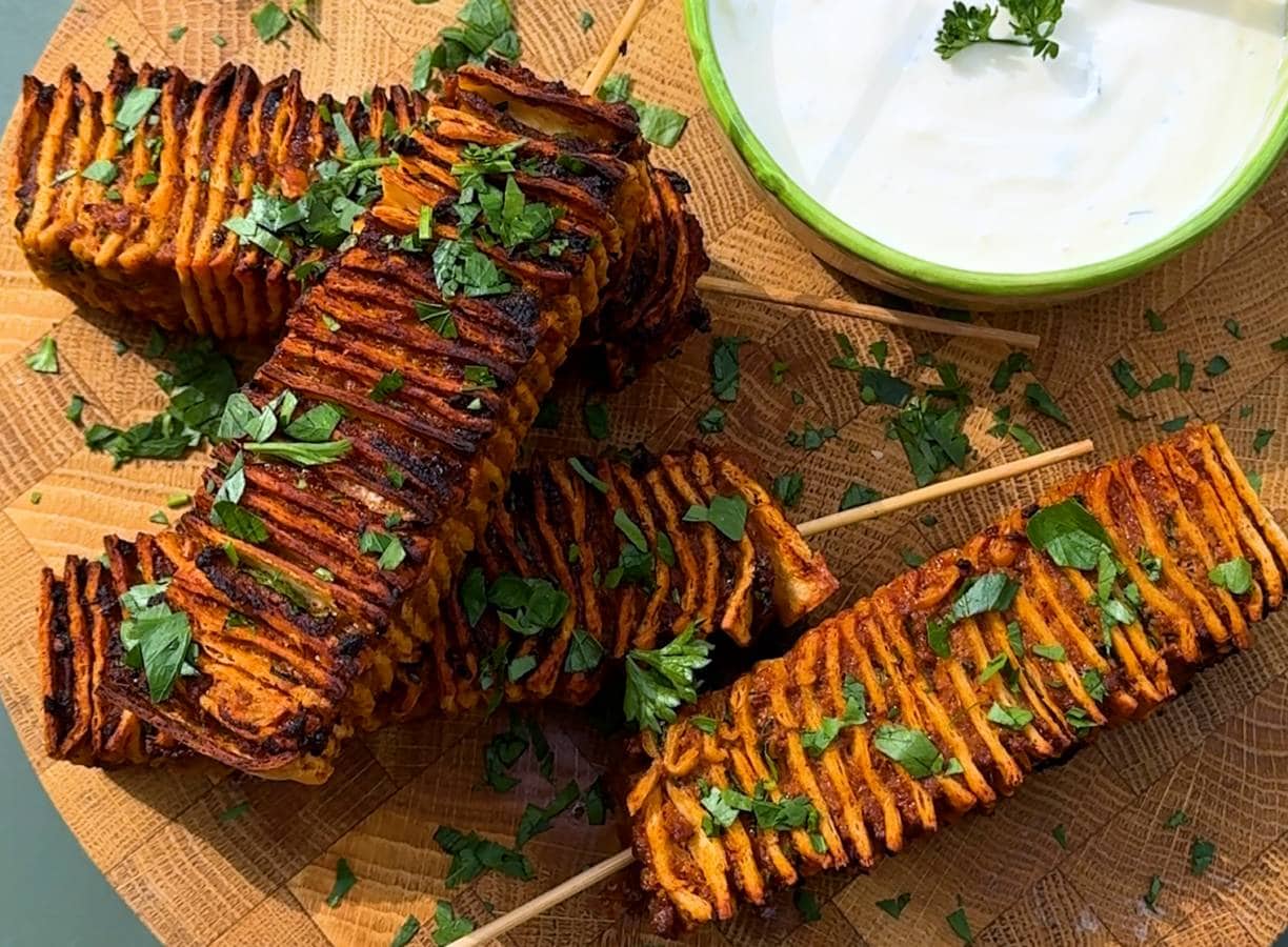 Haal de spiezen uit de airfryer en serveer met de knoflooksaus.