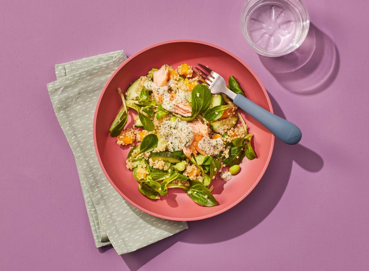 Koken met Kindergarden: Een voedzame, kleurrijke salade met quinoa, zalm en zachte groenten. Perfect voor kinderen en ook lekker voor het hele gezin!