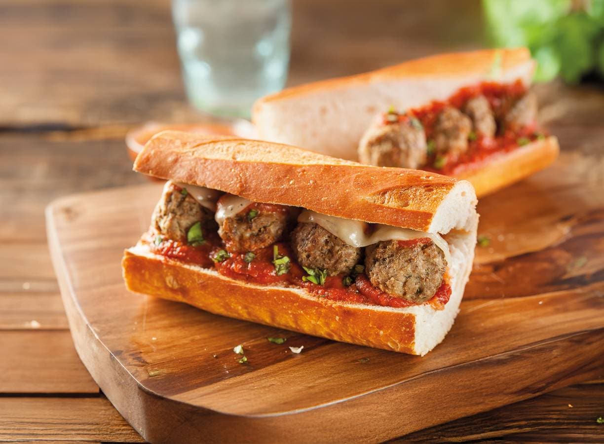 Snijd de baguettes open, vul met 4 gehaktballetjes per stuk, schep extra saus eroverheen en voeg mozzarellaschijfjes toe.