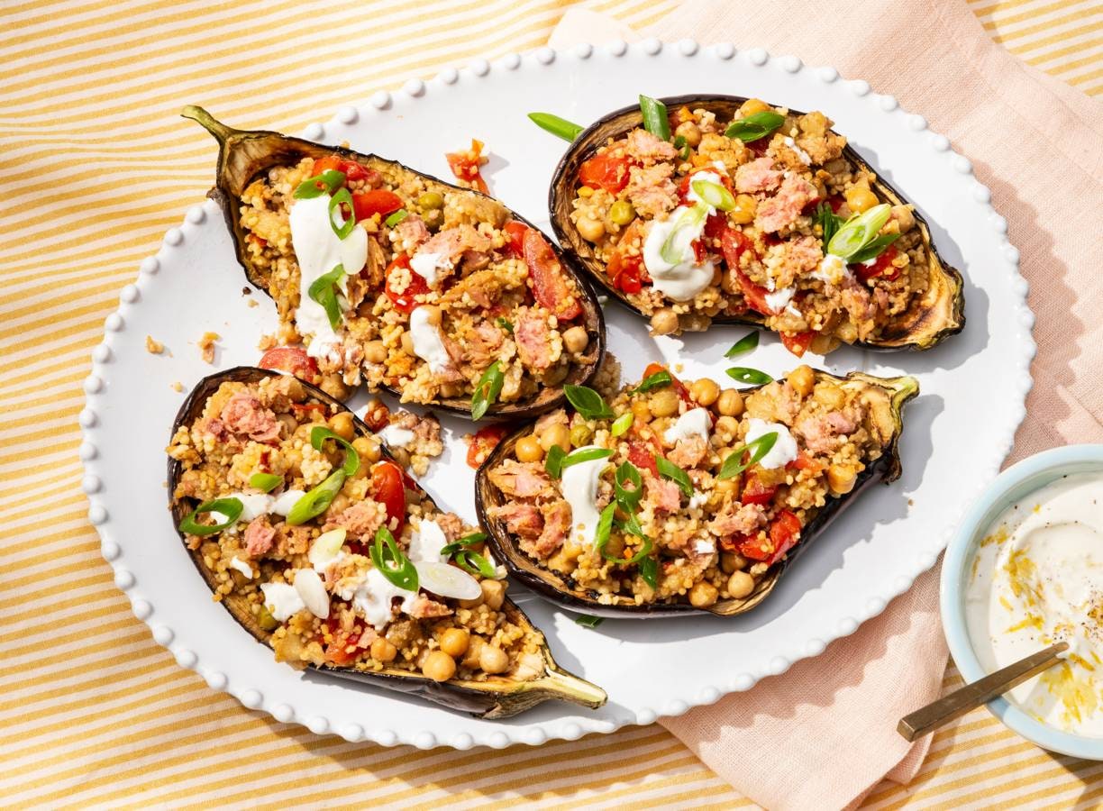 Dit recept van gevulde aubergines met couscous en tonijn is een plaatje om naar te kijken. Besprenkel de aubergines met frisse yoghurt en geniet!