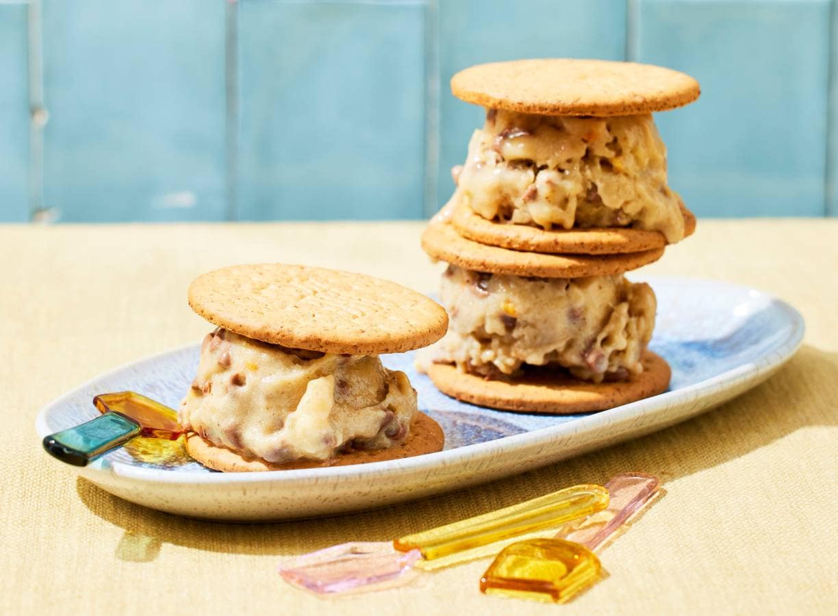 Deze ijssandwich is gevuld met 'nicecream': ijs, maar dan gemaakt van alleen fruit. honing en melk. De banaan geeft het ijs een romige structuur. Maak er een sandwich van met de koekjes en je hebt hét recept voor een toptoetje (of -tussendoortje).
