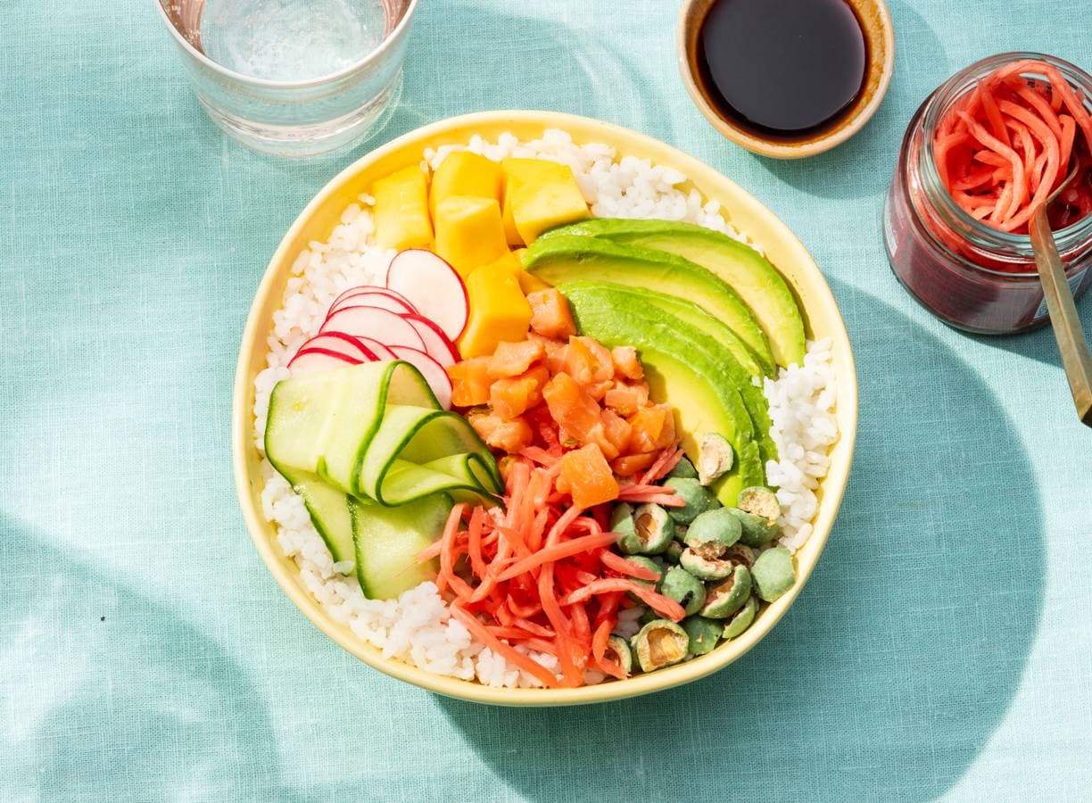 Meng de poke rice met de rest van de rijstazijn en eventueel zout. Verdeel over kommen. Verdeel de zalm, mango, komkommer, radijs, avocado, wasabibollen en de ginger sticks erover. Serveer de rest van de sojasaus erbij.