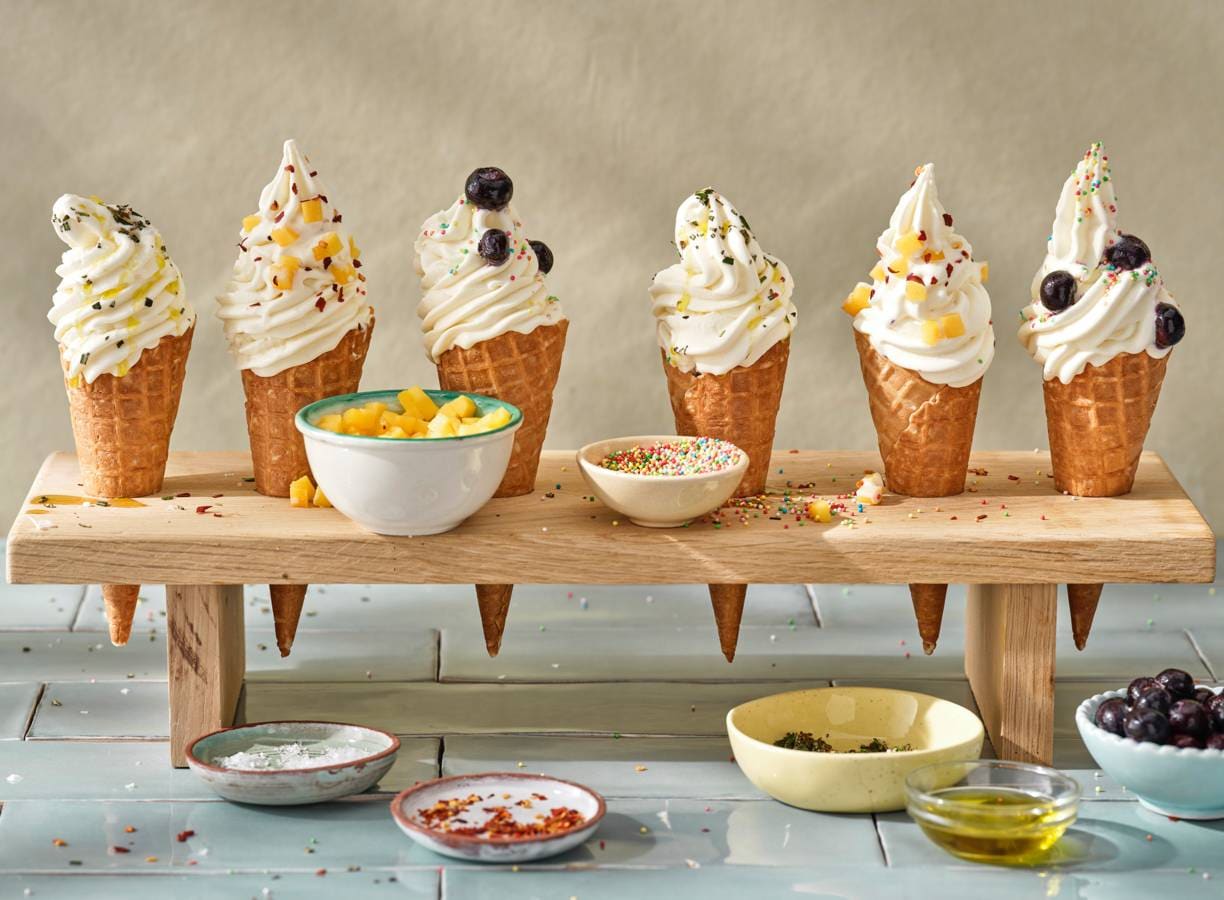 Met dit recept maak je zelf deze romige softijsjes + drie verschillende toppings: eentje met discodip en blauwe bessen, met mango en chilivlokken of kies voor rozemarijn, zeezout en olijfolie. Je weet niet wat je proeft!