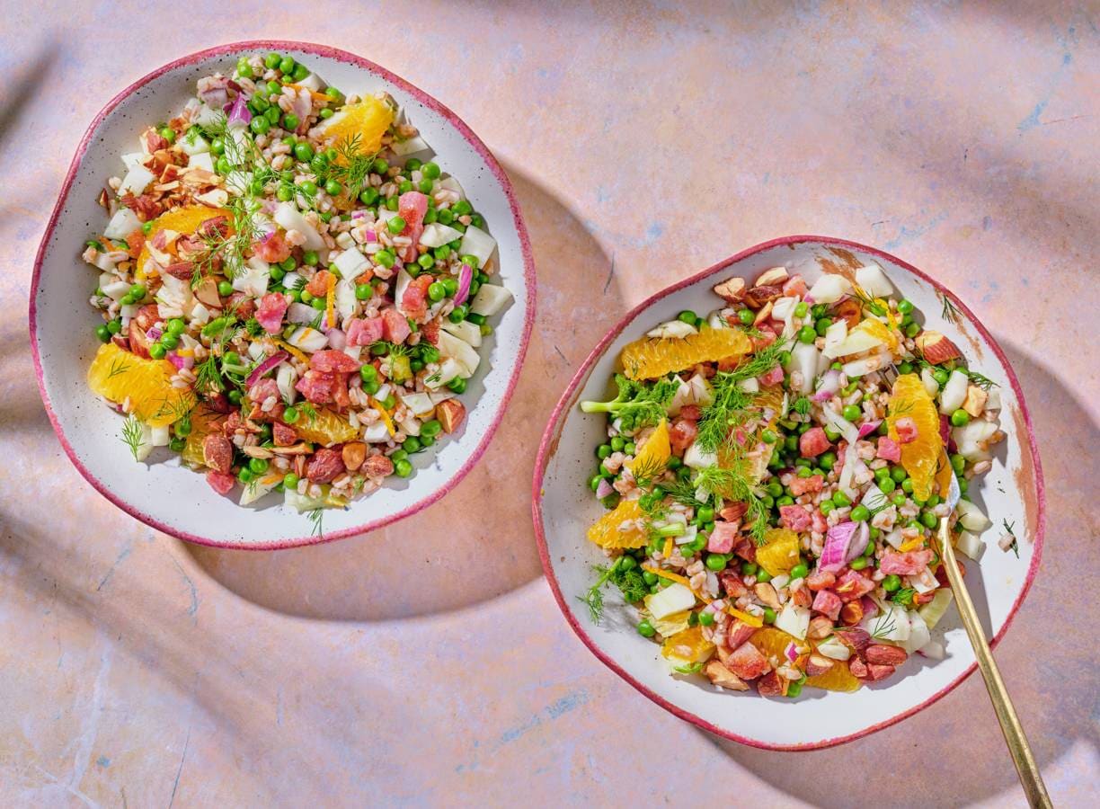 Spelt is een graansoort met een nootachtige smaak en past goed in deze gevulde maaltijdsalade met venkel en tuinerwten. Samen met pancetta en sinaasappel is dit een fris en zomers gerecht.