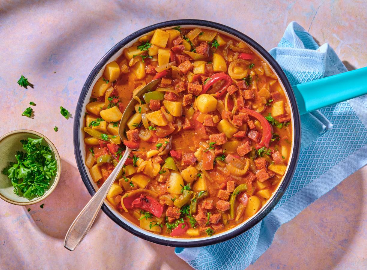 Voeg de aardappel- en tomatenblokjes en de paprikapoeder toe aan de pan. Bak 2 min. en schep goed om. Giet er kokend water bij, breng aan de kook en laat 20 min. op middelhoog vuur stoven met de deksel schuin op de pan. Haal de laatste 5 min. de deksel van de pan, roer af en toe door. Breng op smaak met peper en eventueel zout.