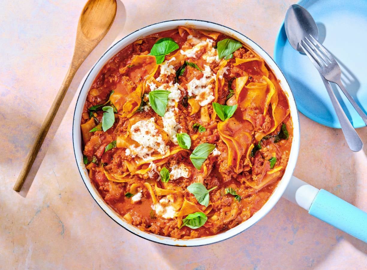 Lasagne zonder oven? Dat kan! Dit eenpansgerecht met tomaat, gehakt en mozzarella zet je binnen 30 min. op tafel. En extra fijn: alles in één pan betekent ook nog eens weinig afwas!