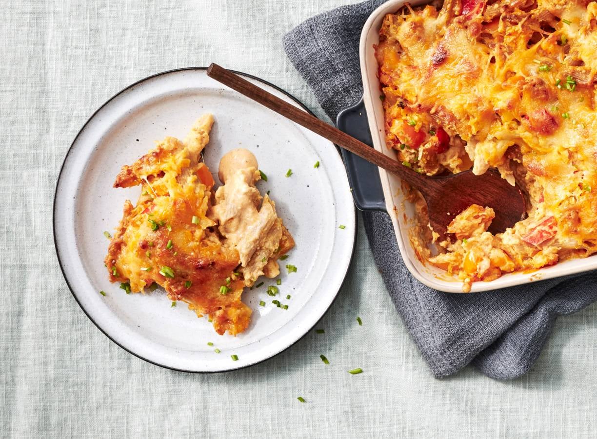 Verwarm de oven voor op 200 °C. Pureer de pompoen, ui en knoflook met de staafmixer tot een gladde saus. Breng op smaak met peper en eventueel zout. Roer de pasta, de stukjes paprika, de zuivelspread, gerookte-paprikapoeder en ⅔ van de geraspte kazen erdoor. Voeg eventueel wat kookvocht toe als de pasta te droog is. Breng op smaak met peper en eventueel zout.