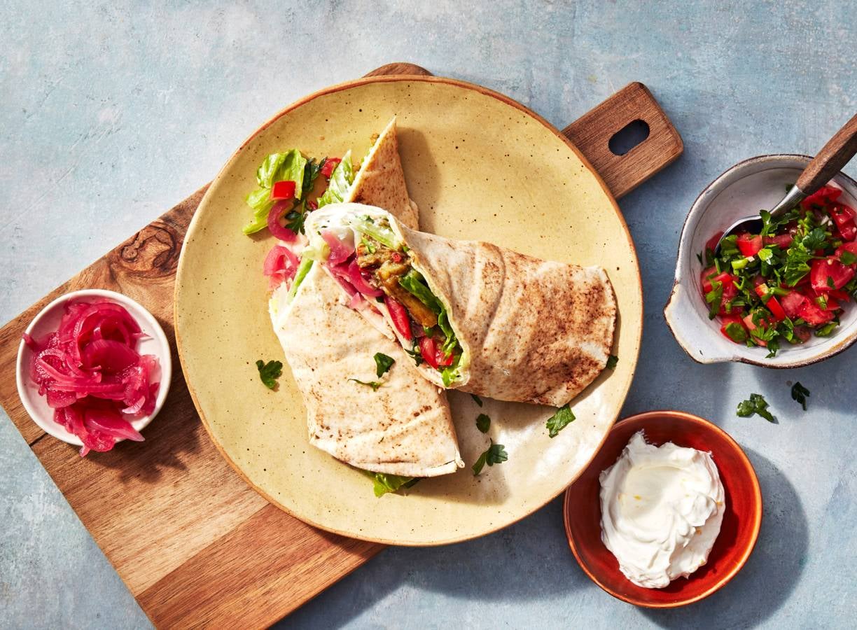 Als je zin hebt in een uitgebreide lunch, moet je vooral voor deze lunchwrap gaan! We maken 'm van flatbread en vullen 'm met o.a. gepofte aubergine (uit de airfryer), roomkaas en groen.