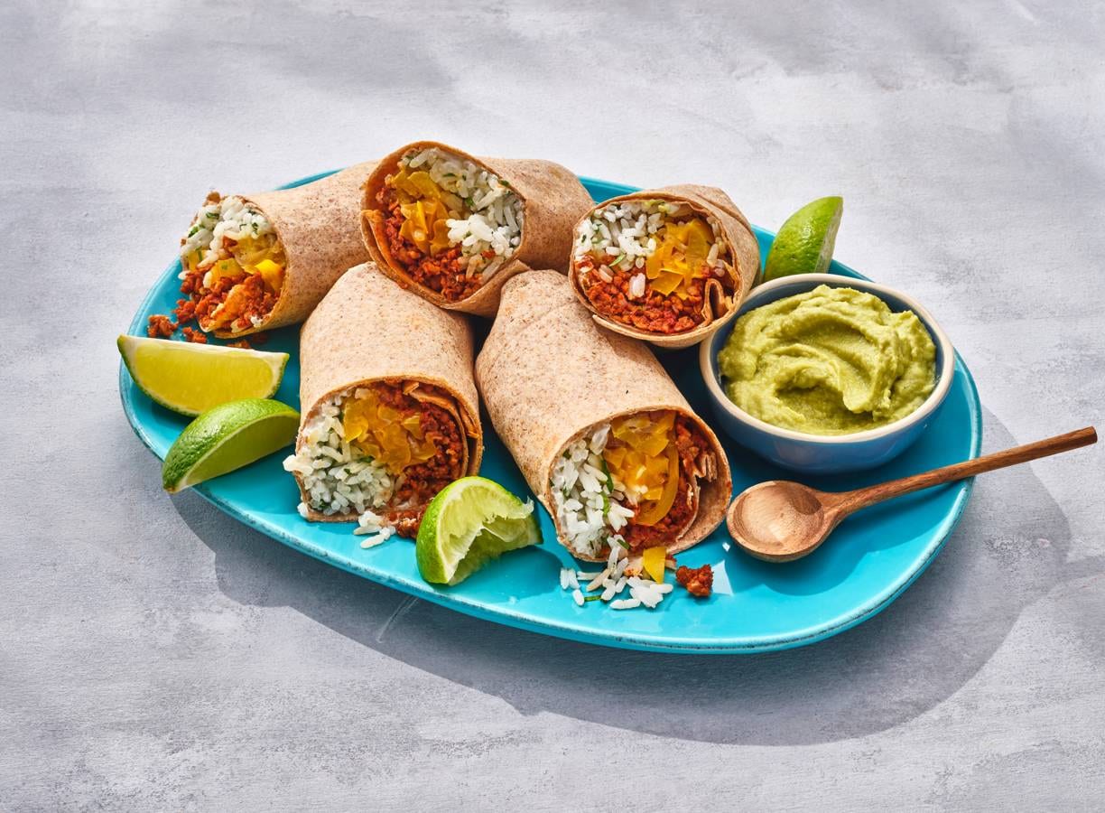 5. Verwarm de wrap volgens de aanwijzingen op de verpakking. Verdeel de sour cream, de rijst, het paprika-uienmengsel en vegagehakt erover. Vouw de zijkanten van de wrap naar binnen en rol vervolgens strak op. Maak zo ook de rest van de burrito’s en snijd ze schuin door. Snijd de limoen in kwarten. Serveer de limoenpartjes en de avocadospread erbij.