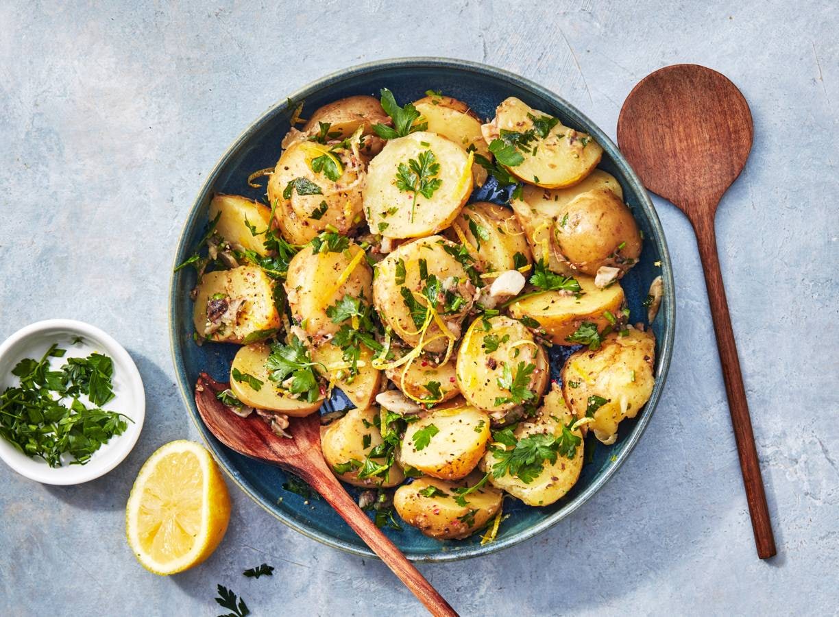 Schep de lauwwarme aardappelen om met de ansjovis-citroendressing en breng op smaak met peper.
