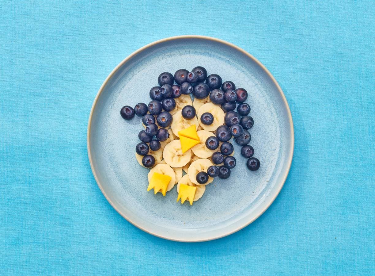 Verdeel de banaan over een bord en verdeel daaromheen de bessen, behalve aan de onderkant. Leg aan elke kant wat extra bosbessen, dit zijn de armpjes. Leg 2 kleine blauwe bessen als oogjes en 2 mangodriehoekjes als snavel op de banaan. Leg de mangopootjes aan de onderkant.